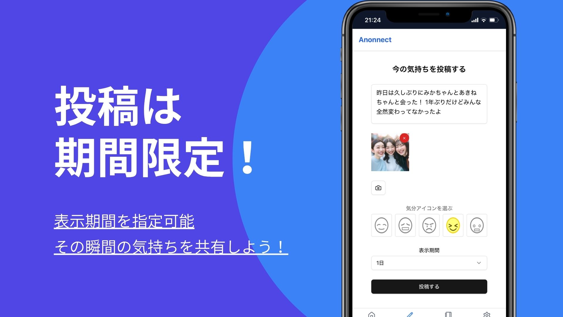 投稿には有効期限が設定され、一定期間後に自動的に削除されるため、安心して自由な発言が可能です。